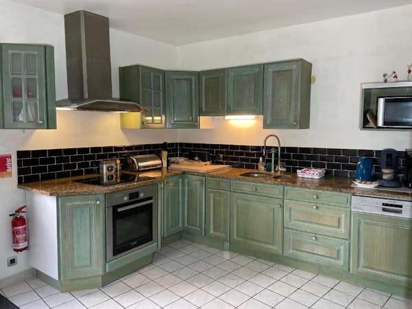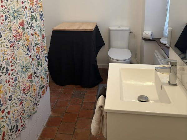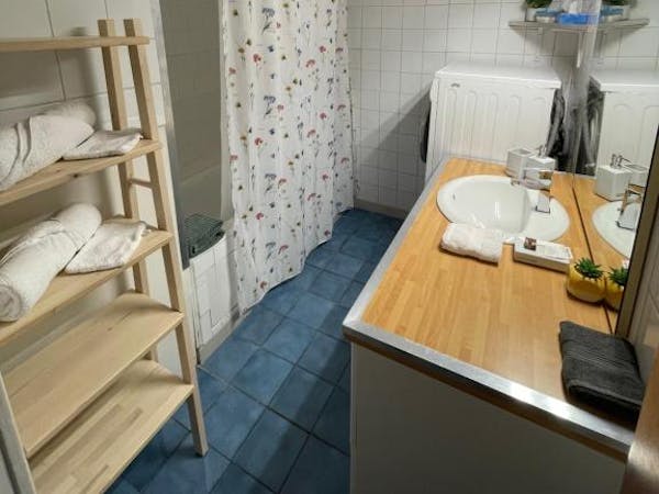 - Komplett ausgestattetes Badezimmer mit Dusche/Badewanne, großer Arbeitsplatte, Waschmaschine und separatem WC.